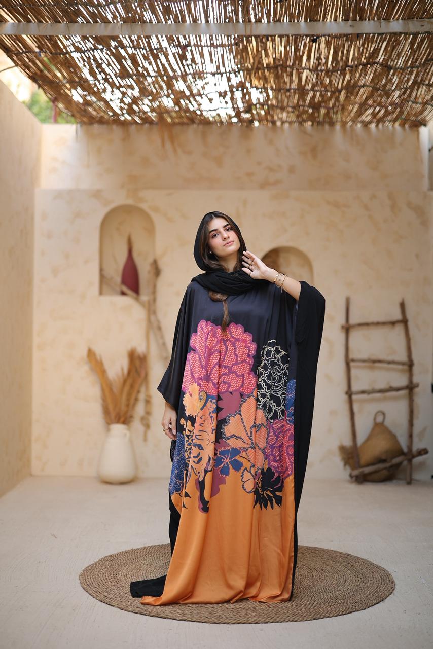 Abaya Mix Soft Mabrad and viscose - black, orange & grey pattern